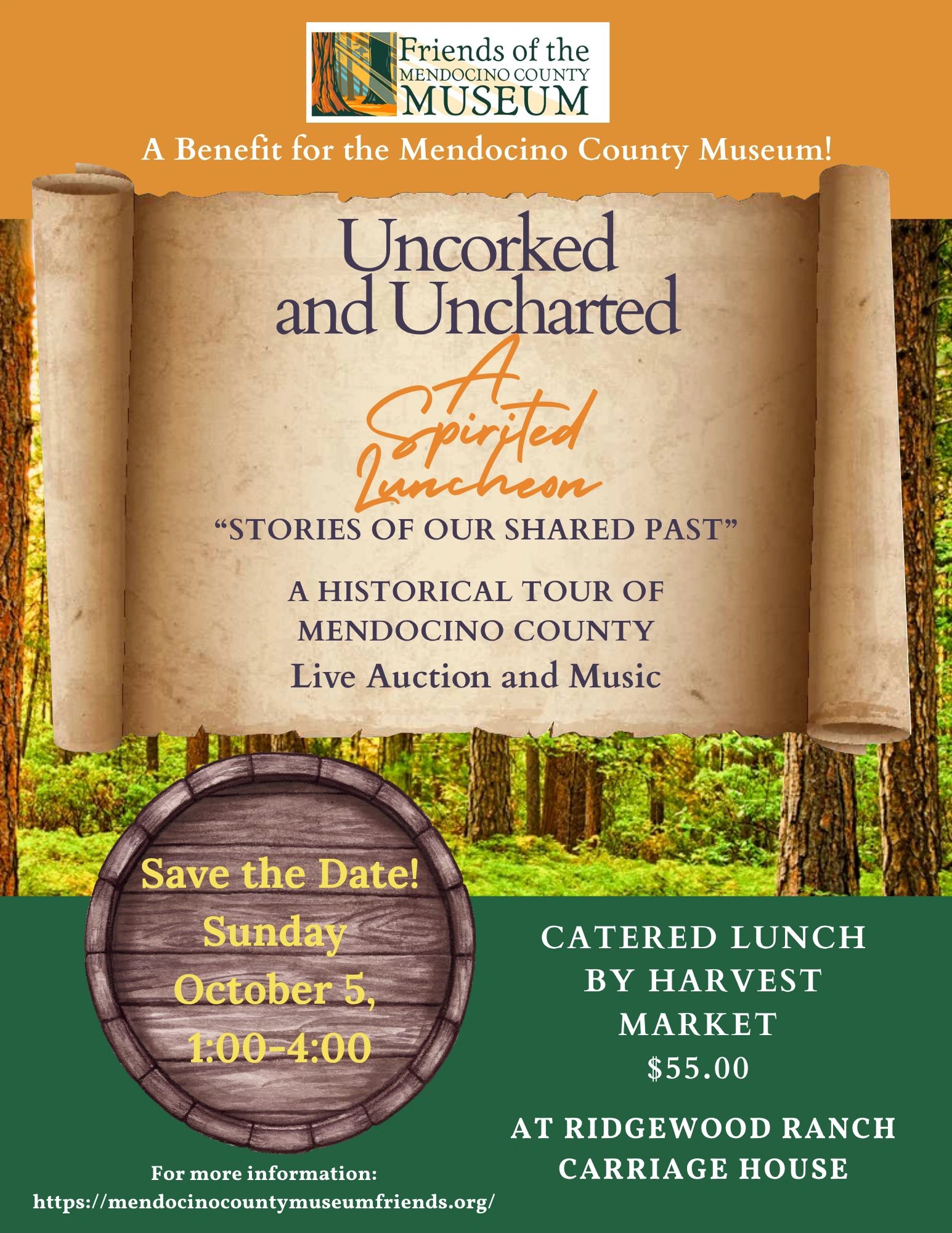 for a Historical tour of Mendocino County, luncheon catered by Harvest Market and an auction of unique items and special packages.